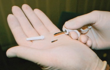 Der Mikrochip, auch Transponder genannt, ist der Reisepass für den Hund. Er besteht aus einer sterilen, bruchsicheren Glaskapsel, in der ein Zahlencode auf einem Mikrochip gespeichert ist. Eingesetzt wird der Chip mit einem speziellen Implantationsgerät auf der linken Halsseite des Hundes. Die Daten können mit einem speziellen Lesegerät abgerufen werden.